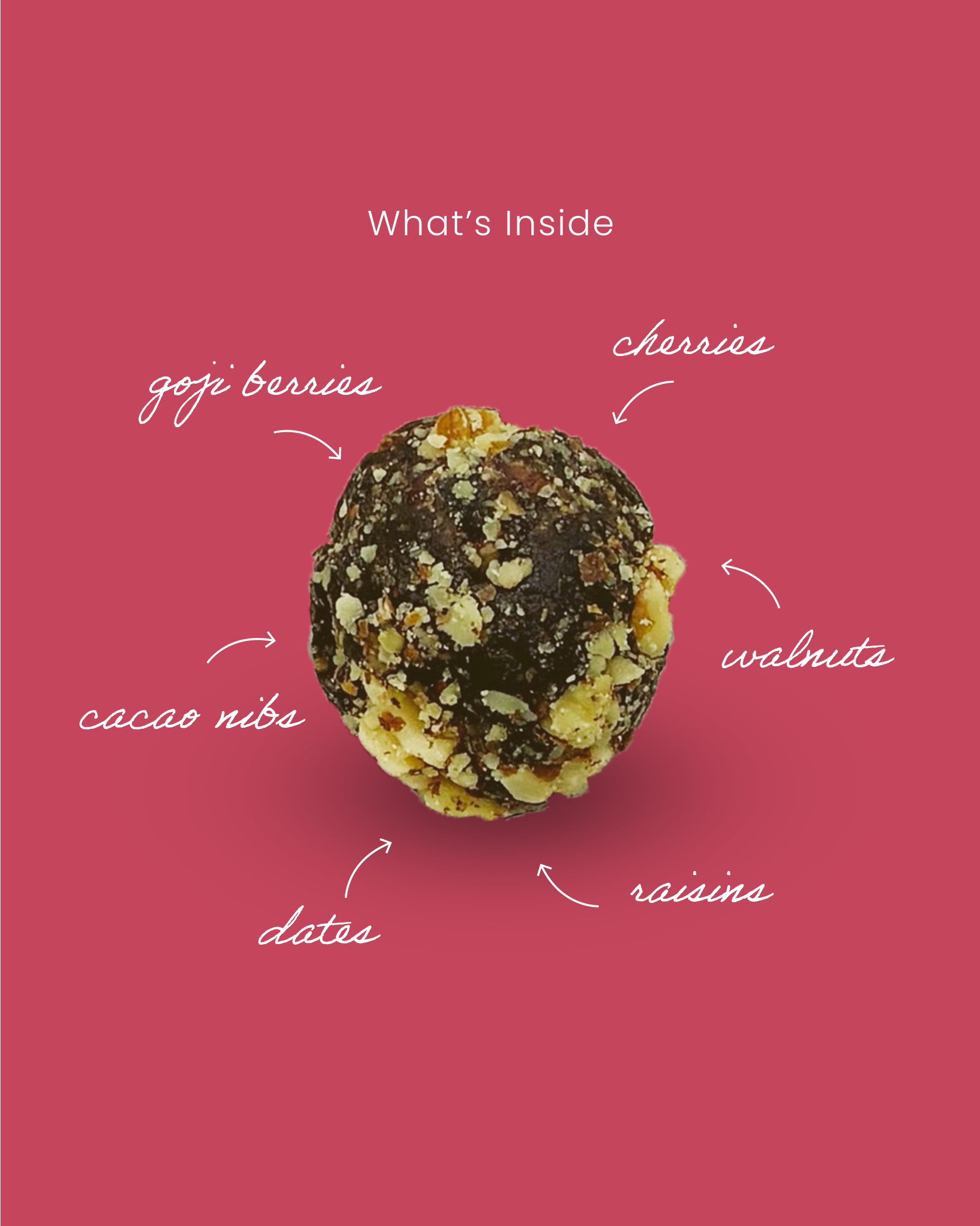 Goji Berry Mix – A vibrant blend of antioxidant-rich fruits and crunchy walnuts, packed with goji berries, cherries, and a hint of cacao nibs for a satisfying treat. Ingredients: Dates, raisins, goji berries, cherries, walnuts, cacao nibs. Pack of 6 Fruit Truffles.