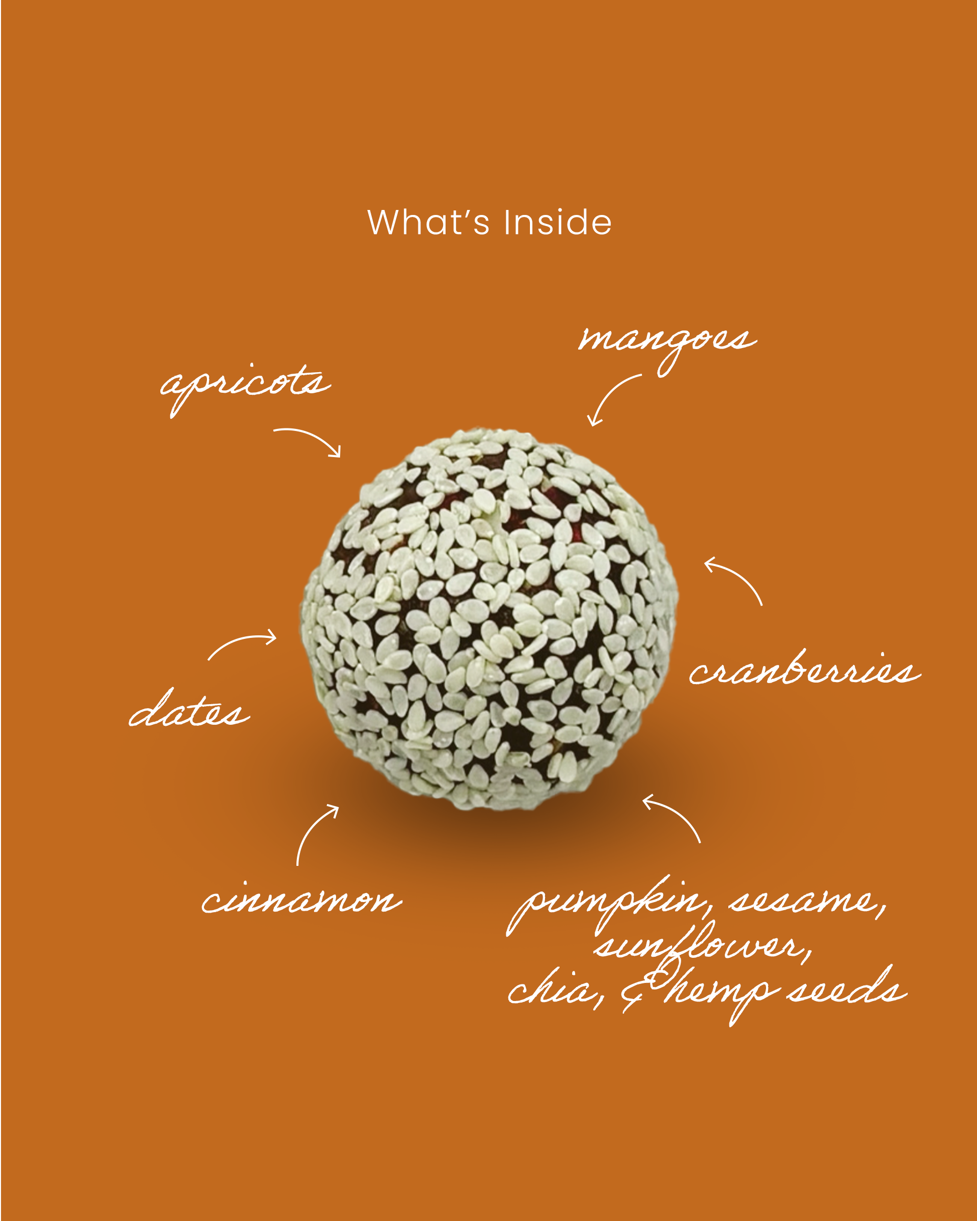 Seedy Mango – A superfood-packed treat with a unique mix of mango and nutrient-rich seeds, including chia, hemp, pumpkin, and sunflower seeds. A burst of flavor and texture in every bite. Ingredients: Dates, apricots, mango, sesame seeds, sunflower seeds, cranberries, chia seeds, hemp seeds, pumpkin seeds and cinnamon. Pack of 6 Fruit Truffles.